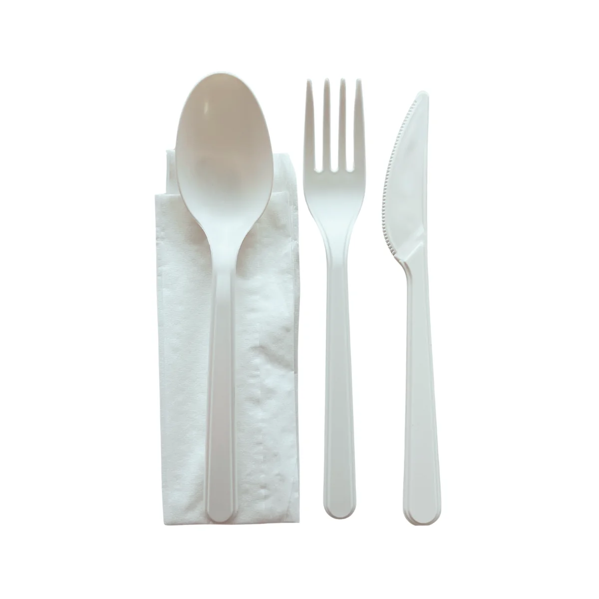 Praktičen CPLA set, ki vsebuje vilico, žlico, nož in servieto, je popolna izbira za priročno in okolju prijazno rešitev pri postrežbi hrane. Izdelki so narejeni iz trajnostnega materiala CPLA (kristalizirane polimlečne kisline ter koruznega in krompirjevega škroba), ki je biološko razgradljiv in kompostabilen. Možnost večkratne uporabe.