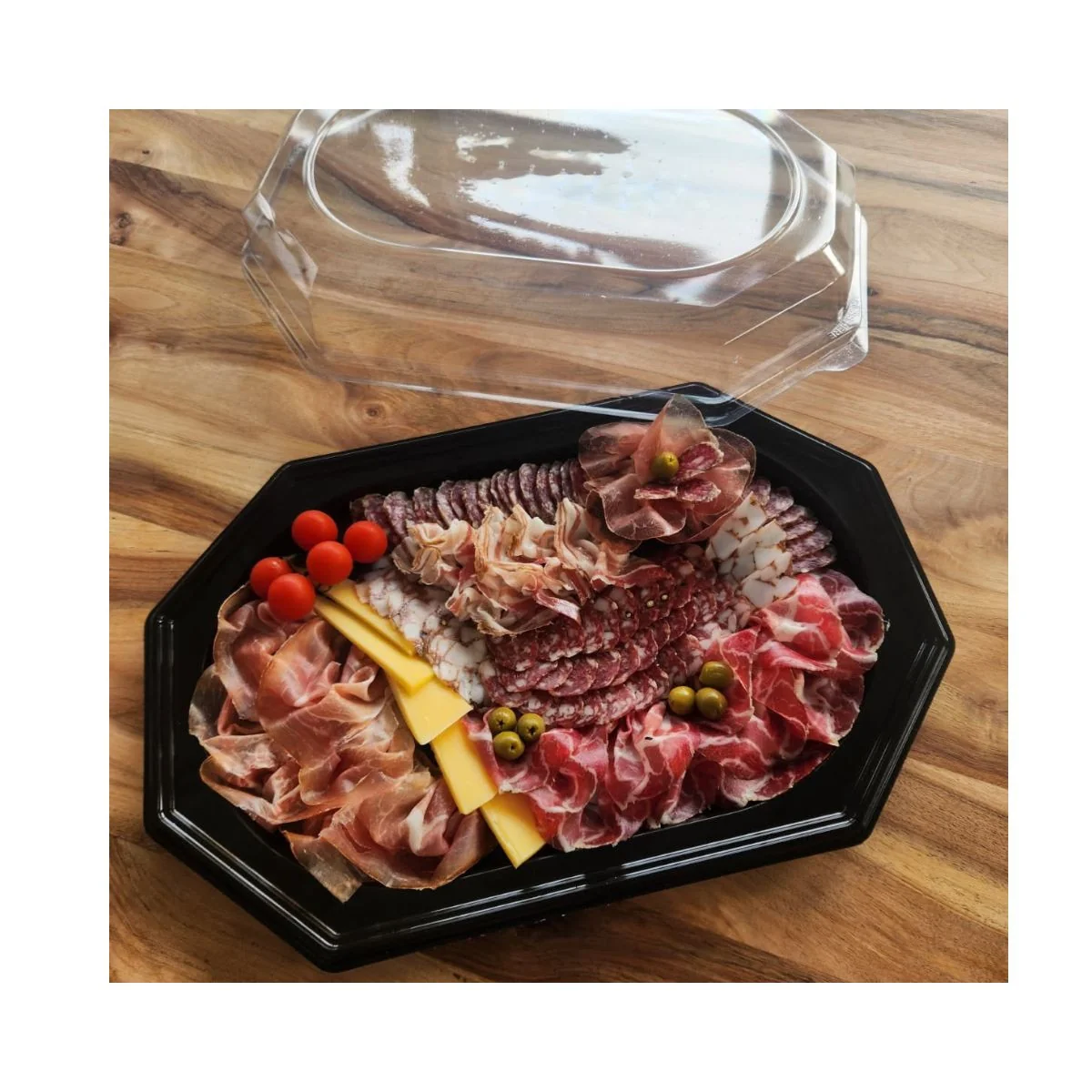 Črn pladenj iz recikliranega rPET-materiala z transparentnim pokrovom – idealen za serviranje in transport jedi. Cena je za 1 kos.